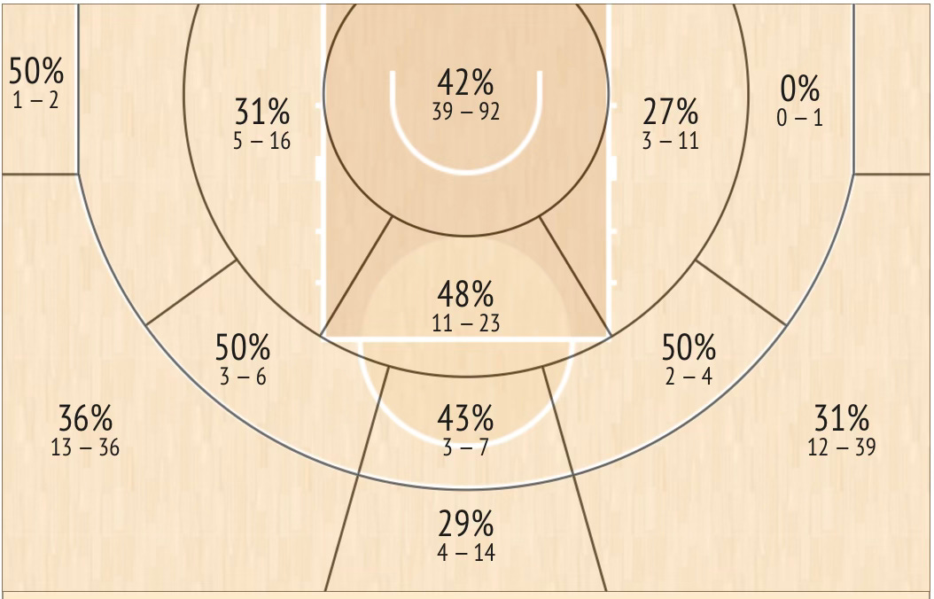 En penetración, su finalización depende más de la técnica que de su verticalidad. Cuando hablo de técnica, tengo que mencionar como se genera su espacio en Pick & Roll, a través del serpenteo alrededor del grande (Gortat Screen). Se apoya en bombas, extensiones y ángulos poco convencionales para evitar tapones y generar tiros de alto porcentaje. Su toma de decisiones cerca del aro es madura: fuerza lo justo, no se precipita y rara vez desperdicia una ventaja clara.