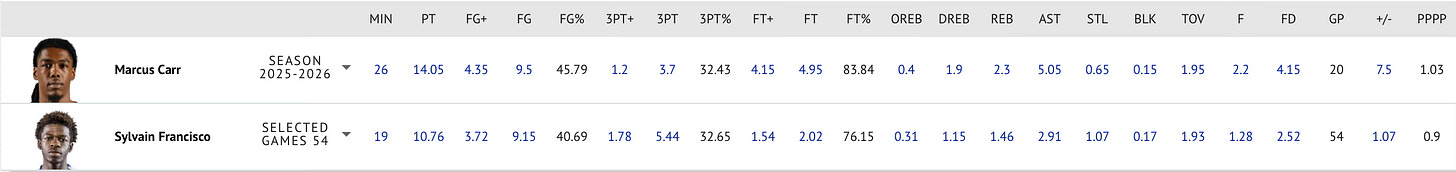 Carr entiende cómo manipular la segunda línea defensiva, un rasgo poco común en guards jóvenes que salen de NCAA. Identifica dónde está la ayuda temprana, dónde queda liberado el tirador en el lado débil y cuándo el interior está estableciendo posición ventajosa tras el roll. Su capacidad para manipular el Pick & Roll es élite, y lo demuestra posesión tras posesión. Se equivoca muy poco y sabe perfectamente como manipular las distintas defensas que le pueden lanzar.