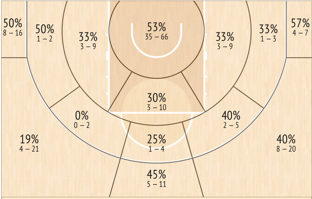 Su principal fortaleza en ataque, viene de la mano del Catch & Shoot, como he dicho antes tiene que ejecutar no puede generarse para sí mismo. Durante esta temporada, promedia casi un 40% desde la larga distancia (1,45/3,7). Tiene buena mecánica y buen fluidez y creo que su tiro exterior es trasladable a un mejor equipo y liga, siempre y cuando siga tirando a pies quietos. Según la estadística avanzada, acumula 2,2 posesiones por partido, con una eficiencia de 1,3 puntos por posesión, lo que significa que es un jugador peligroso si recibe a pies quietos.